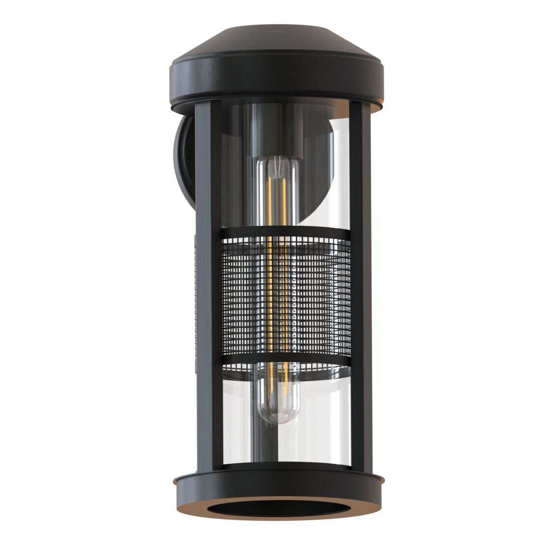 Bringing modern style to the front porch, deck or garden, this Erma lantern-style outdoor wall sconce is designed with a screen detail and glass cylinder shade. Featuring an all-weather black powder-coated finish for added durability